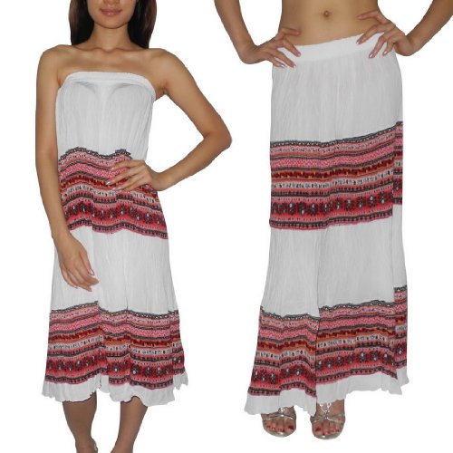 Womens Thai Boho Flowing Gathered / Smocked Bodice Crinkle Summer Dress / Skirt - White & Red - Size: one size Review